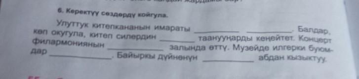 6. Керектүү сөздөрдү койгула. Улуттук китепкананын________ _____ имараты Балдар, көп окугула, китеп силердин______ таанууңарды кеңейтет. Концерт филармониянын_______ залында өттү. Музейде илгерки буюмдар_____ Байыркы дүйнөнүн_____ абдан кызыктуу.