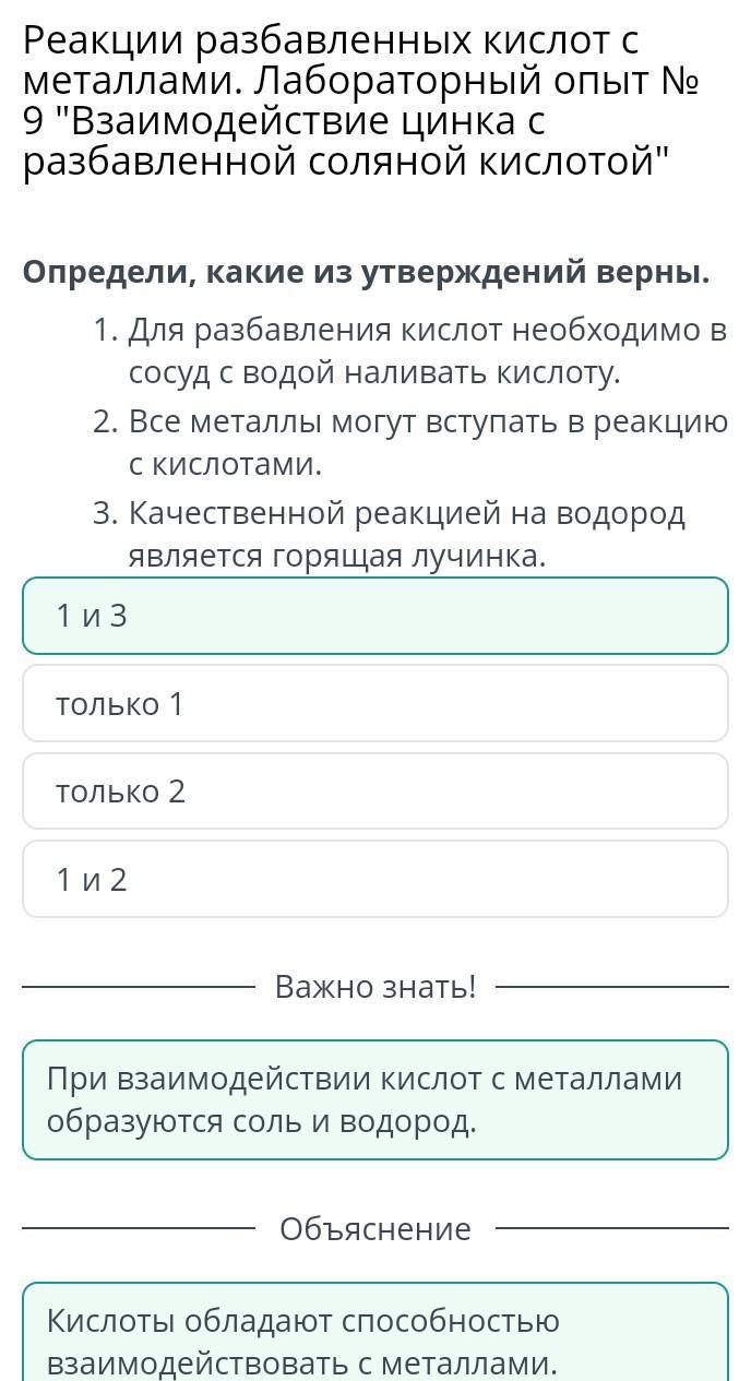 Реакции разбавленных КИСЛОТ С металлами. Лабораторный опыт № 9 "Взаимодействие цинка с разбавленной соляной кислотой" Определи, какие из утверждений верны. 1. Для разбавления кислот необходимо в сосуд с водой наливать кислоту. 2. Все металлы могут вступать в реакцию с КИСЛОтами. 3. Качественной реакцией на водород является горящая лучинка. ТОЛЬКО 1 ТОЛЬКО 2 1 и 2 1 и 3