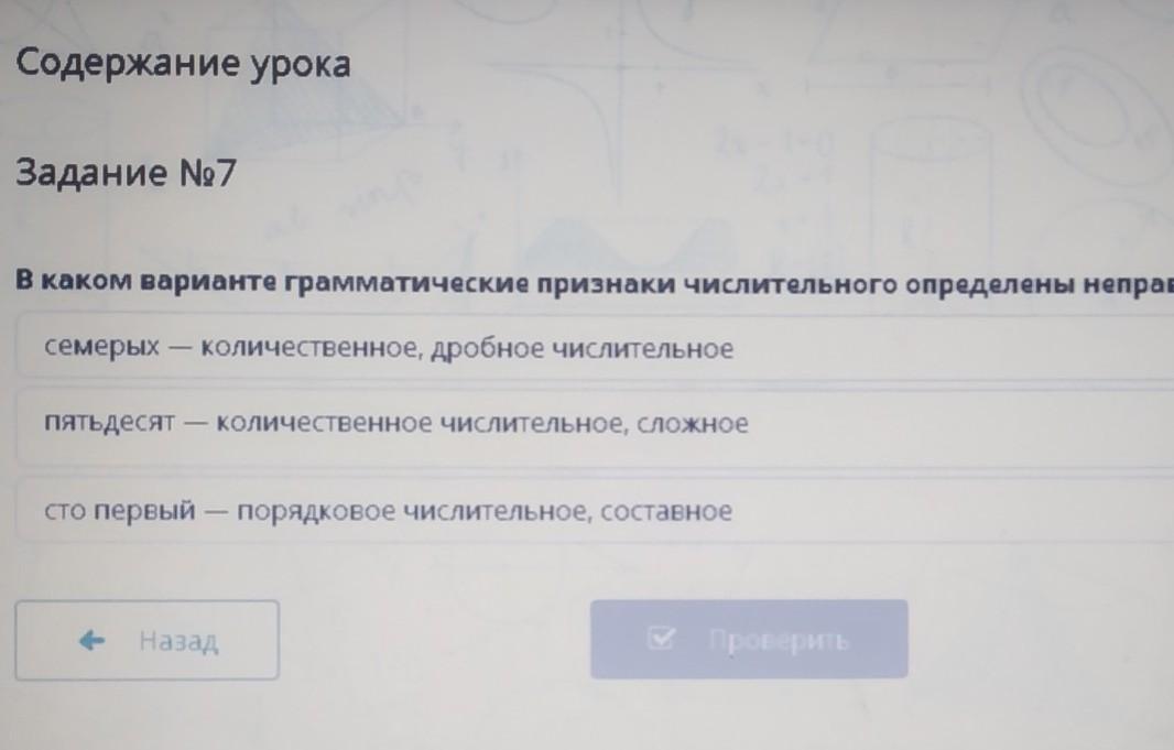Задание No7 В каком варианте грамматические признаки числительного определены неправильно?