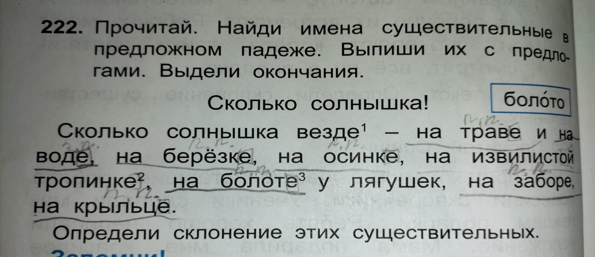 Прочитай. Найди имена существительные в предложном падеже. Выпиши их с предлогами. Выдели окончания. Определи склонение этих существительных Сколько солнышка везде- на траве и на воде,на берёзке,на осинке,на извилистой тропинке,на болоте у лягушек,на заборе,на крыльце.