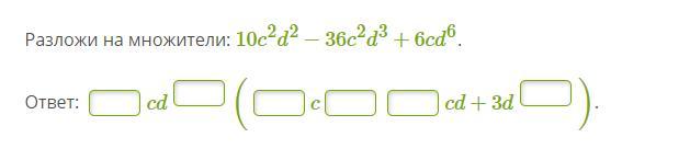 Разложи на множители: 10c^2d^2-36c^2d^3+6cd^6