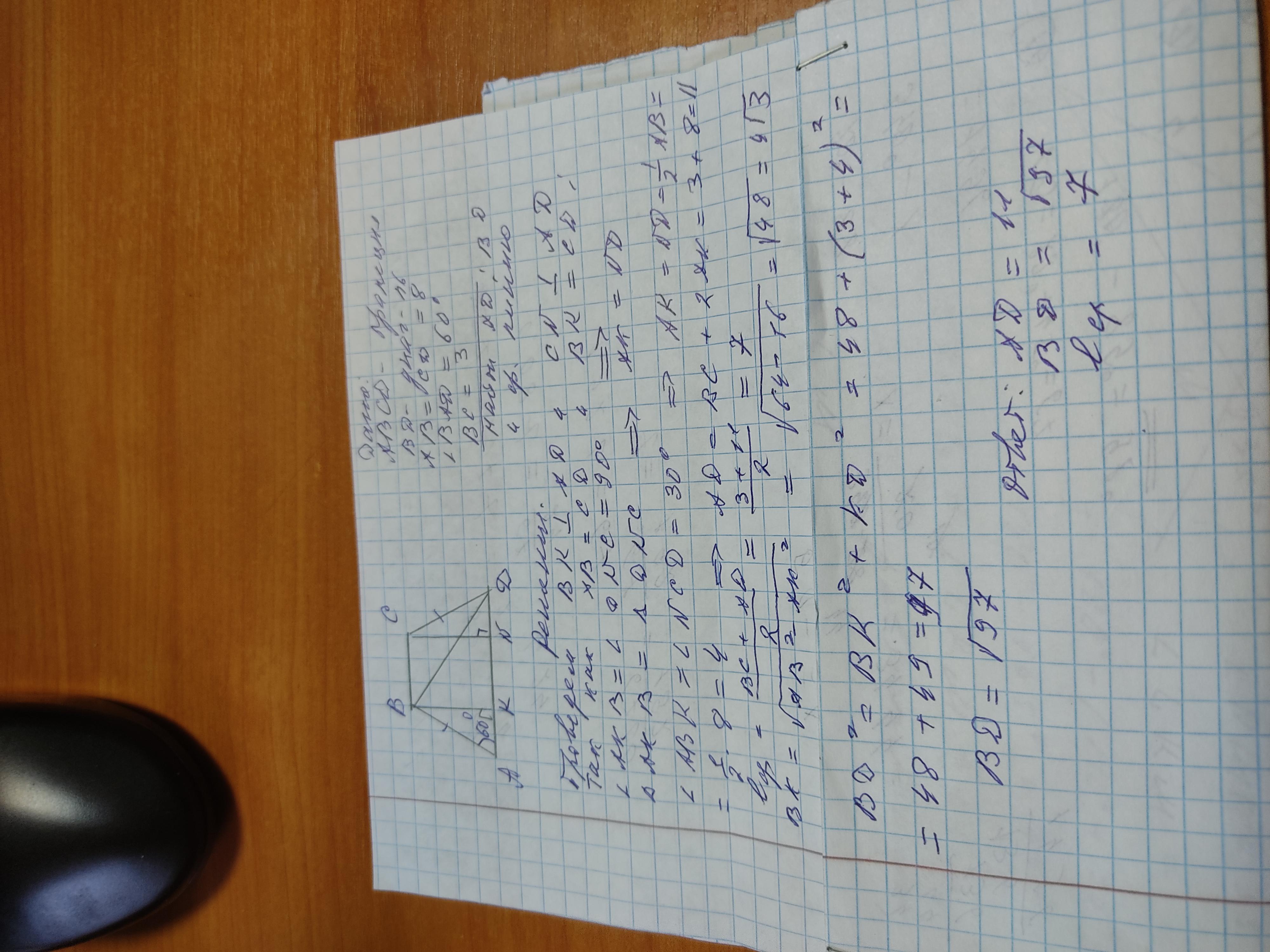 трапеция ABCD. диагональ BD ,AB=CD=8 , угол ВАД = 60 градусов , BC =3. найти AD, BD. среднюю линию