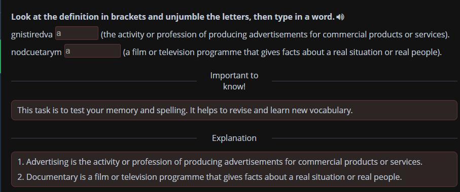 Спасибо! Правильно. То есть ответы: 1) advertising; 2) documentary.
