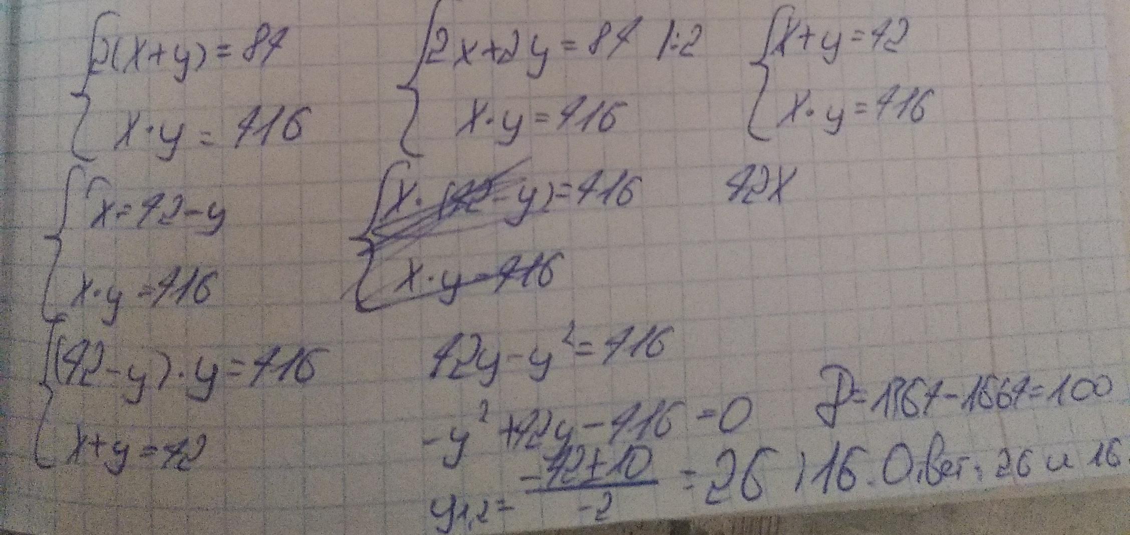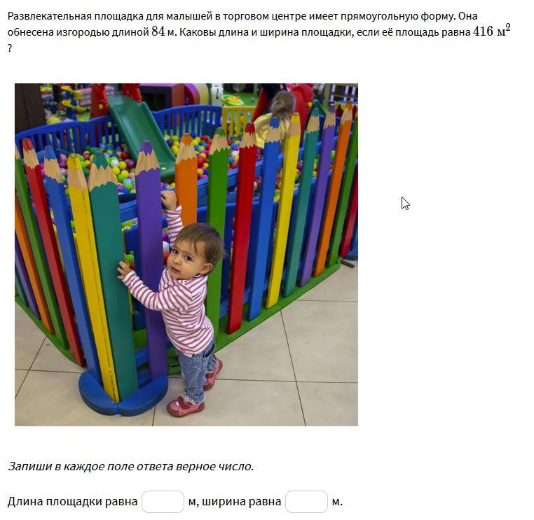Развлекательная площадка для малышей в торговом центре имеет прямоугольную форму. Она обнесена изгородью длиной 84 м. Каковы длина и ширина площадки, если её площадь равна 416 m2 ?