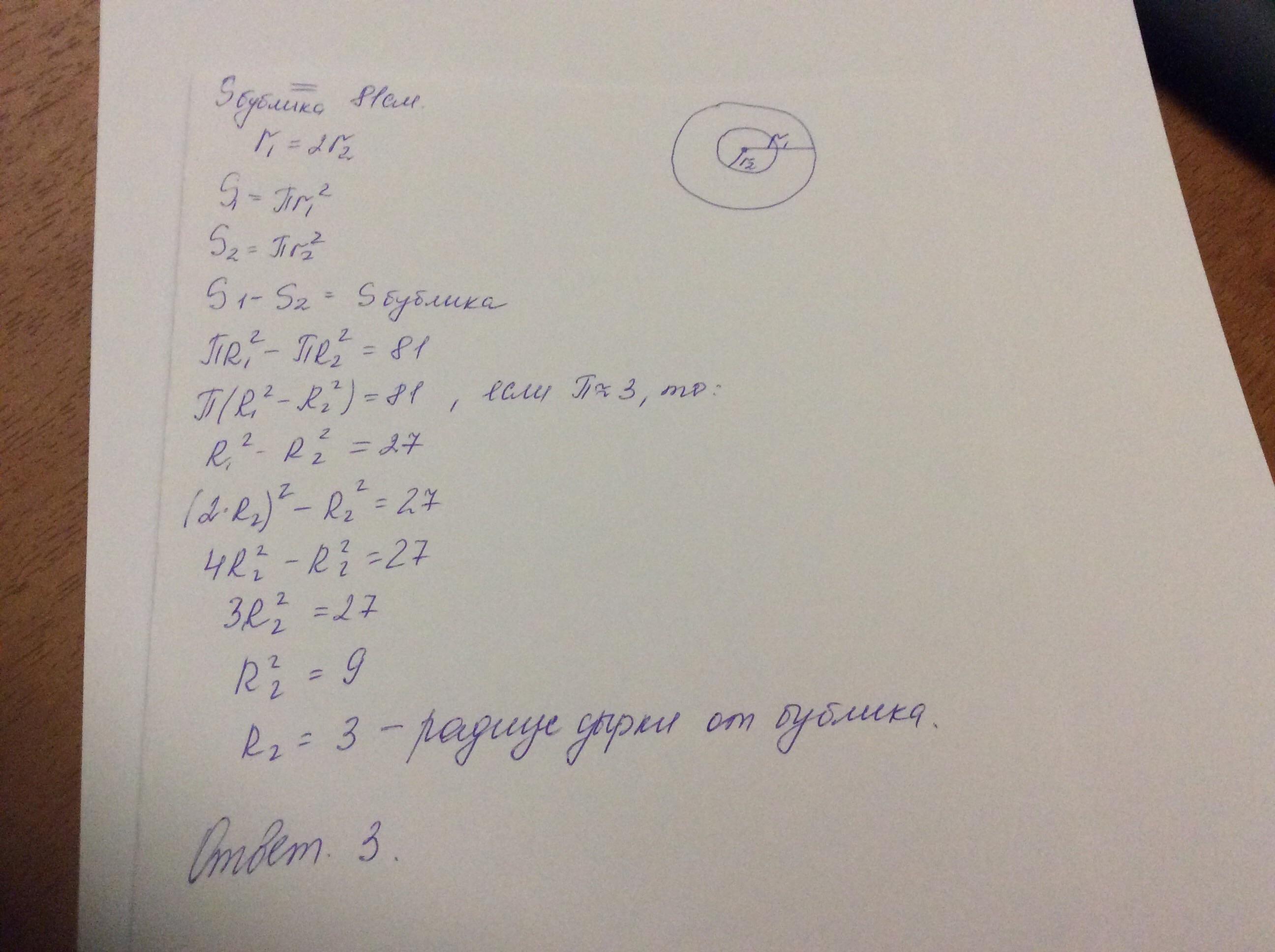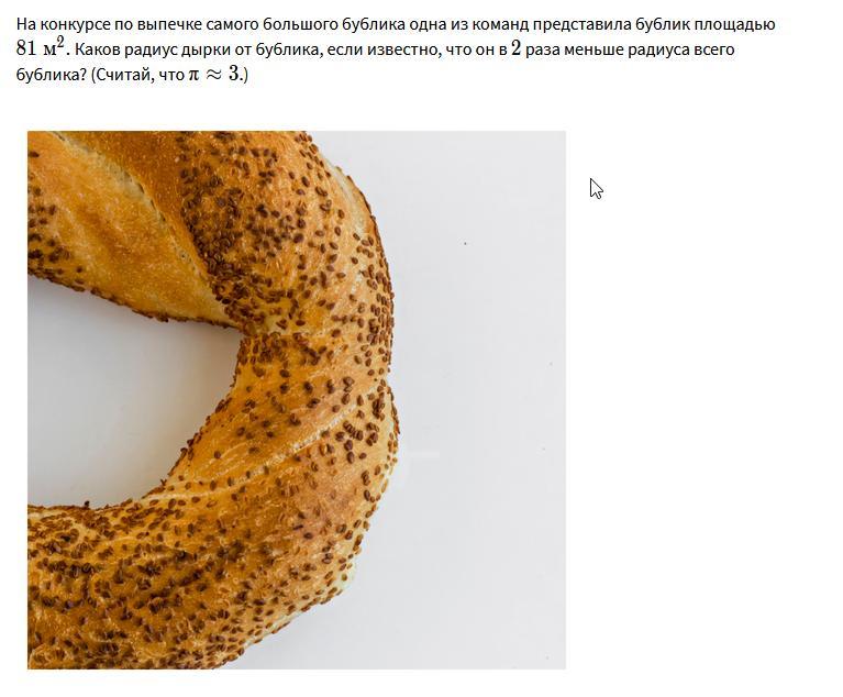 На конкурсе по выпечке самого большого бублика одна из команд представила бублик площадью 81м2. Каков радиус дырки от бублика, если известно, что он в 2 раза меньше радиуса всего бублика? (Считай, что π≈3 .)