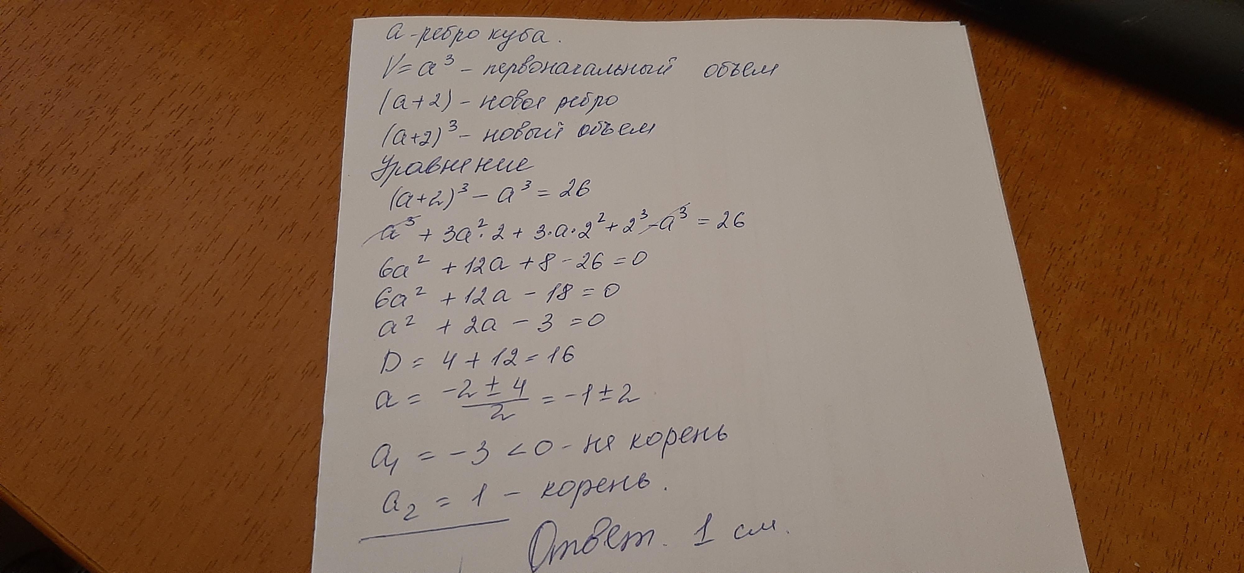 Каждое ребро куба увеличили на 2 см. При этом объем увеличился на 26 см3. Найди длину ребра первоначального куба.