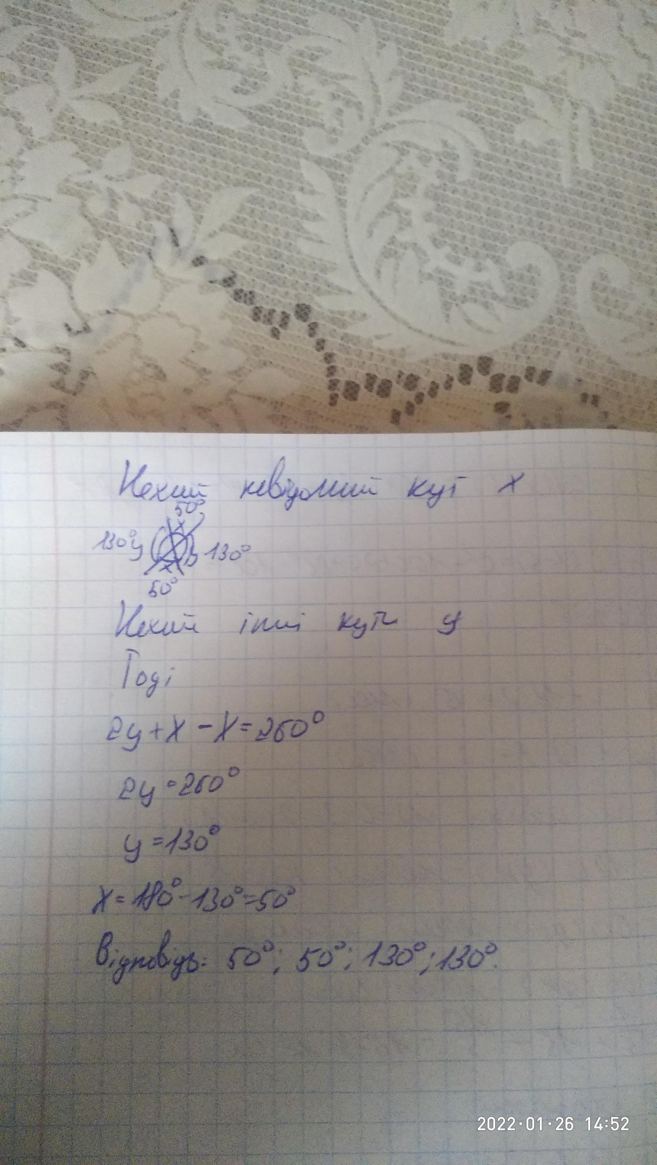 один із чотирьох кутів утворений при перетині двох двох прямих на 260 градусів менший за суму трьох інших знайдіть ці кути