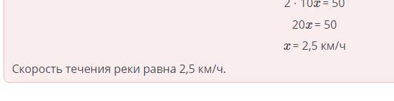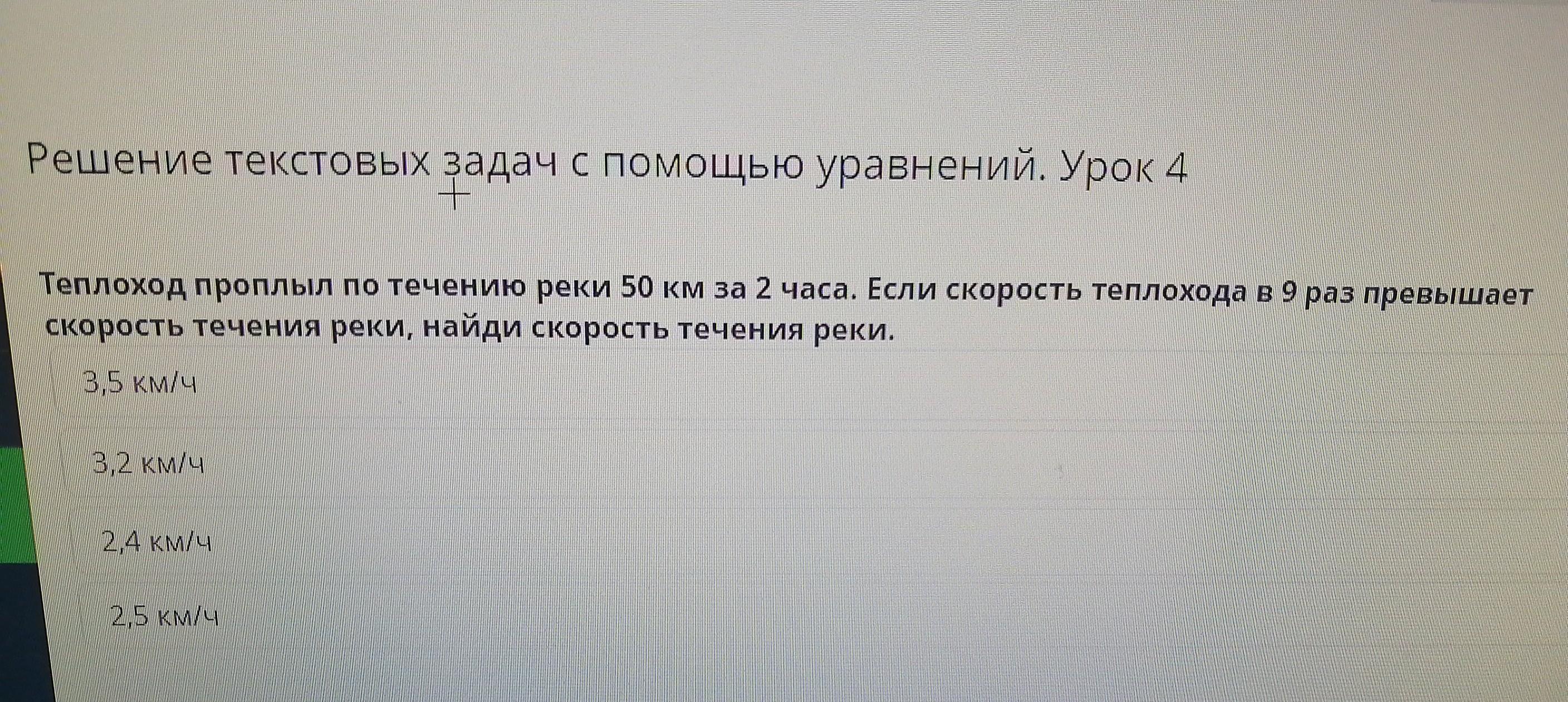Решение текстовых задач с помощью уравнений. Урок 4 Теплоход проплыл по течению реки 50 км за 2 часа. Если скорость теплохода в 9 раз превышает скорость течения реки, найди скорость течения реки. 2,5 км 3,2 KM 2,4 км/ч 2,5 км/