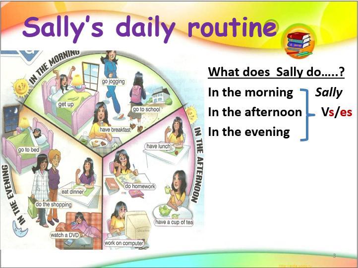 In the morning Sally gets up, goes jogging, then she has breakfast and goes to school.