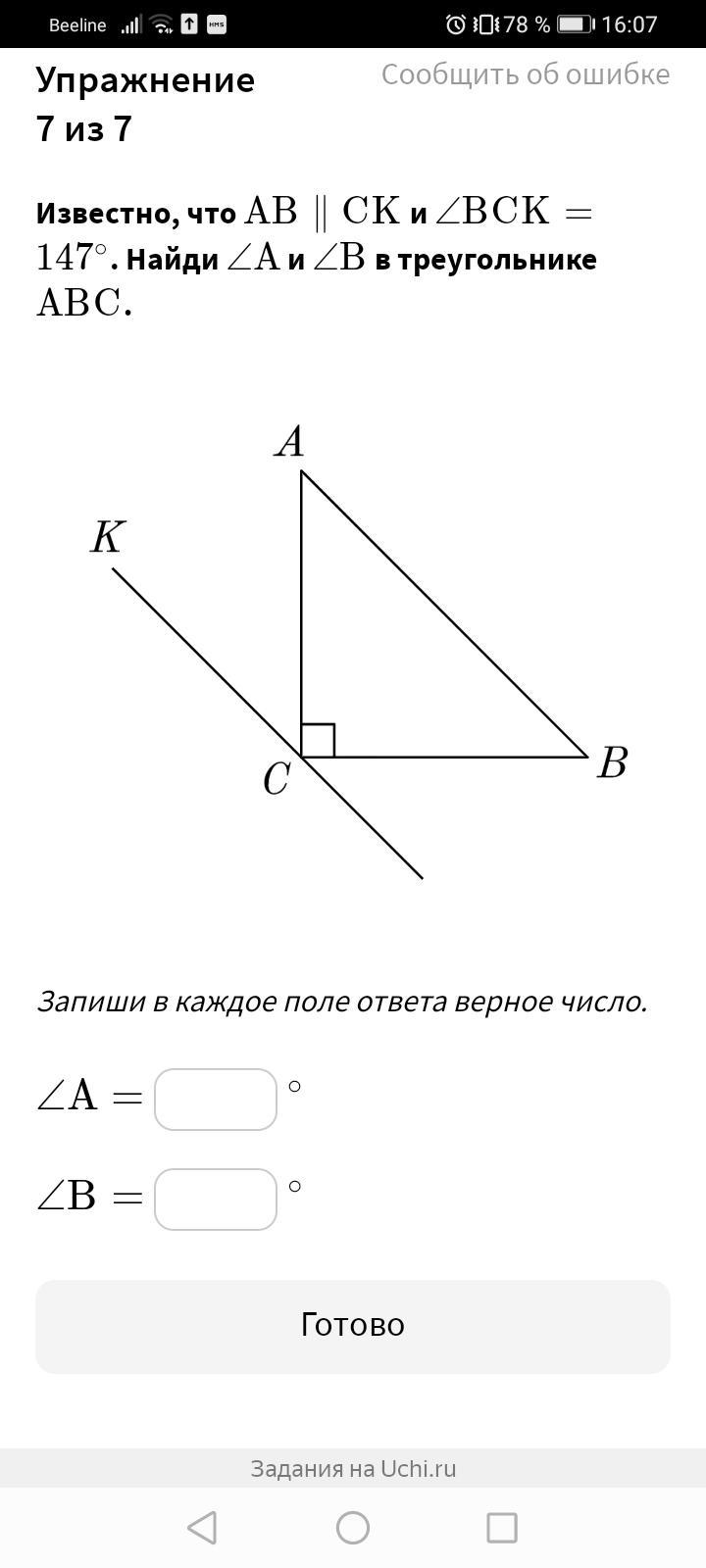 По скольку треугольник АВС - прямоугольный и угол С - 90°, то сумма двух остальных углов будет равна 90°, ведь сумма всех углов треугольника равна 180°