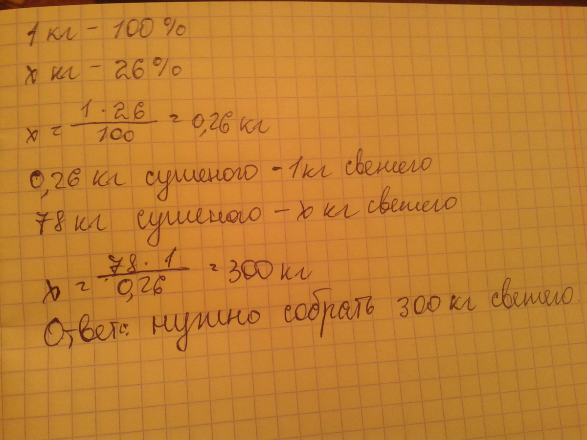 Липовый цвет при сушке теряет 74% своего веса. Сколько надо собрать свежего цвета,чтобы получить 78 кг сушеного?