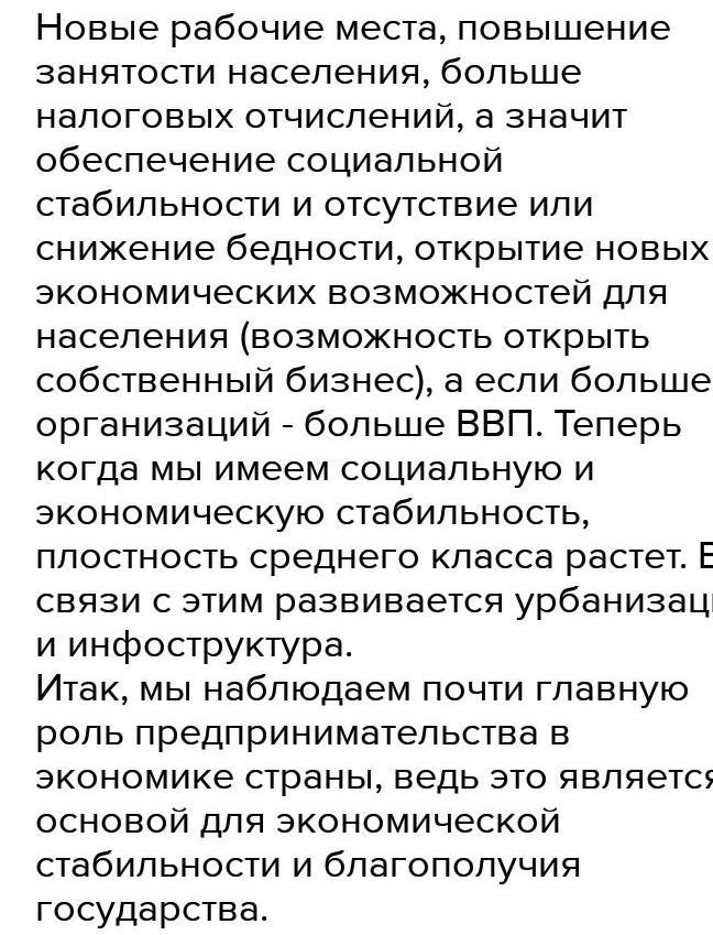 Предпринимательство играет важную роль в экономике, оно тесно связано с решением её основных задач. Всё, что производит предприниматель (товары, услуги), неразрывно связано с жизнедеятельностью людей, предназначено для потребления обществом. Поэтому важно, чтобы государство, общество в целом помогали бизнесу, создавали условия для его развития.