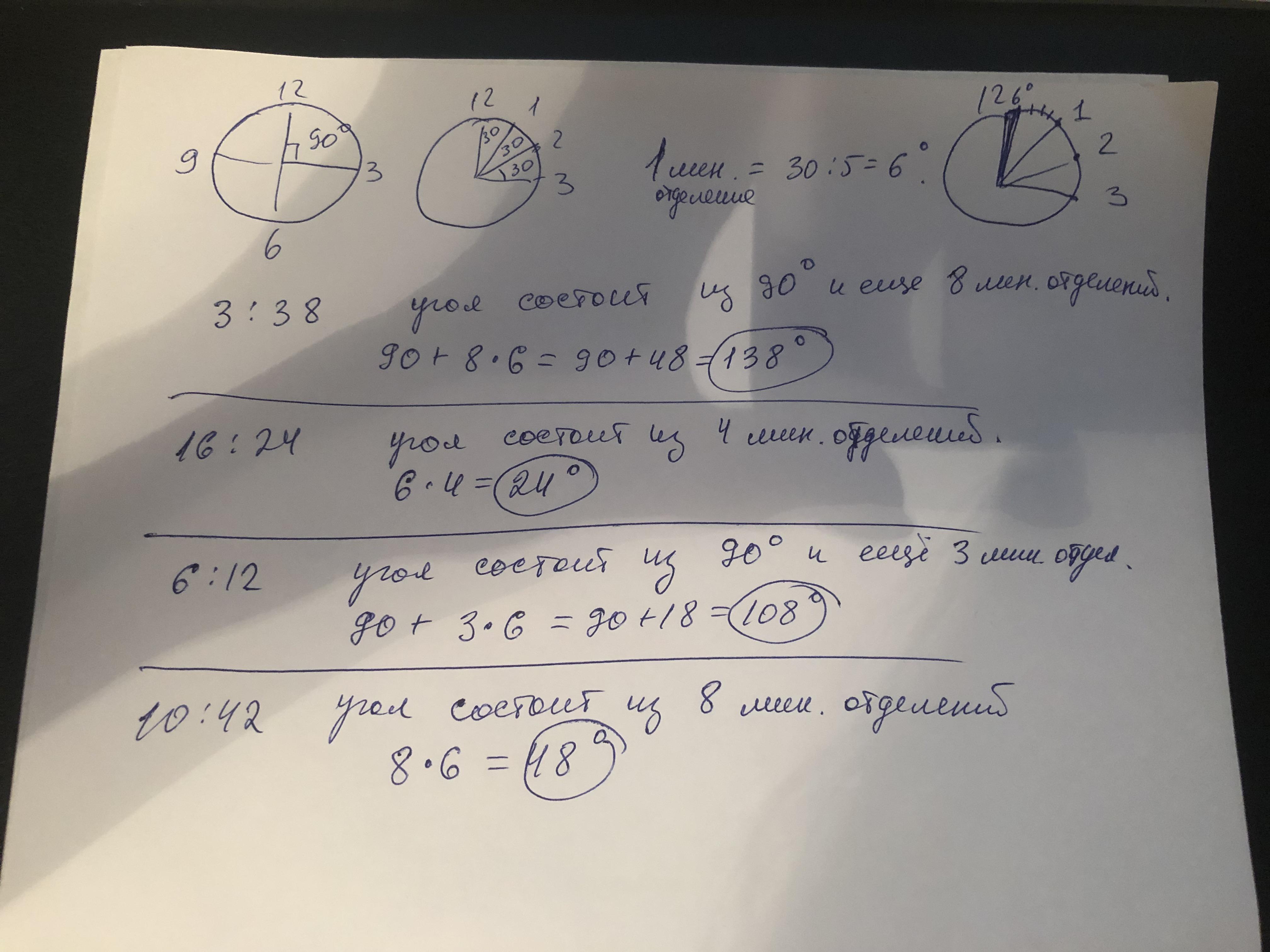 Если брать из расчета, что часовая стрелка стоит четко на цифре, то смотрите расчеты ниже на фото.