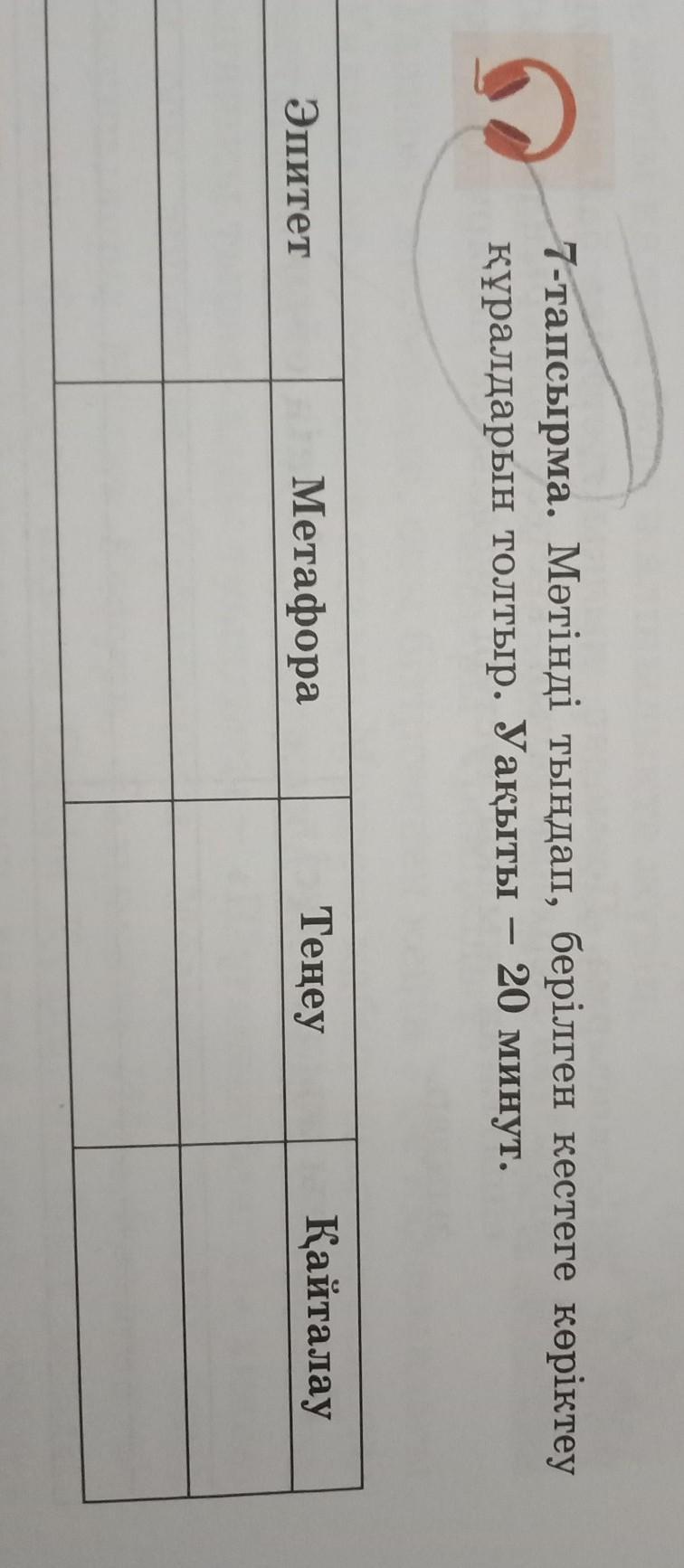 7-тапсырма. Мәтінді тыңдап, берілген кестеге көріктеу құралдарын толтыр. Уақыты – 20 минут.