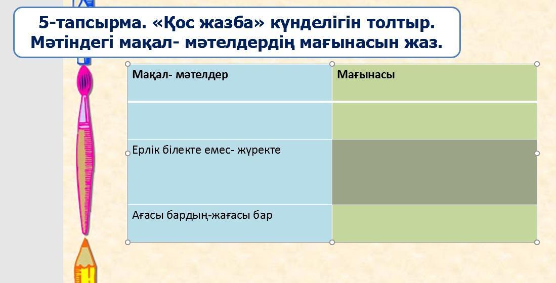 1.Азаматтықтың, батырлықтың бір негізі-осы бауырмалдықтан шығады. Ерлік аспаннан түспейді, ол Отанды сүюден басталады. Ал Отанды сүю үй ішіңнен, отбасынан өседі. Өз отбасын сыйлап құрметтеген адам халқының да қадіріне жетеді. Халқын қадірлеген сын сағаттан сүрінбей өтеді. Елін сүйген-ер атанады. Өйткені ерлік білекте емес, жүректе.