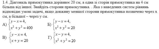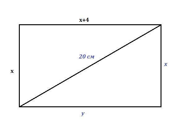 Діагональ прямокутника дорівнює 20 см, а одна зі сторiн прямокутника на 4 см більша від іншої. Знайдіть сторони прямокутника. . Яка з наведених систем рiвнянь відповідає умовi задачі, якщо довжину меншої сторони прямокутника позначено через х см, а більшої - через у см.
