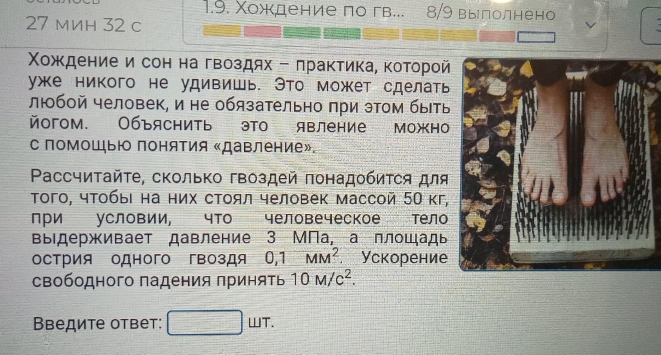 Давление человека на 1 гвоздь: p = F/S = 490:10⁻⁷ = 4,90*10⁹ (Па)