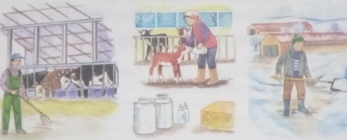 3-жаттығу. Суреттер бойынша мәтін құра. Тірек сөздер: мал, қора, суару, жем беру, қар күреу.