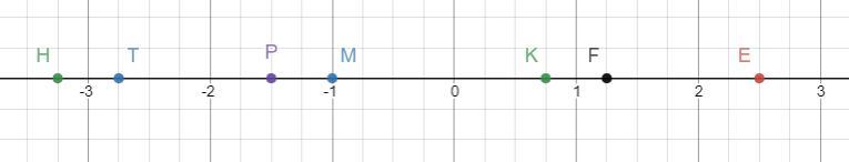 начертите координатную прямую,взяв за единичный отрезок,длина которого в 4 раза больше стороны клетки тетради. отметьте точки M(-1),K(0,75),P(-1,5),F(1 1/4), E(2 1/2), T(-2 3/4), H(-3 1/4)
