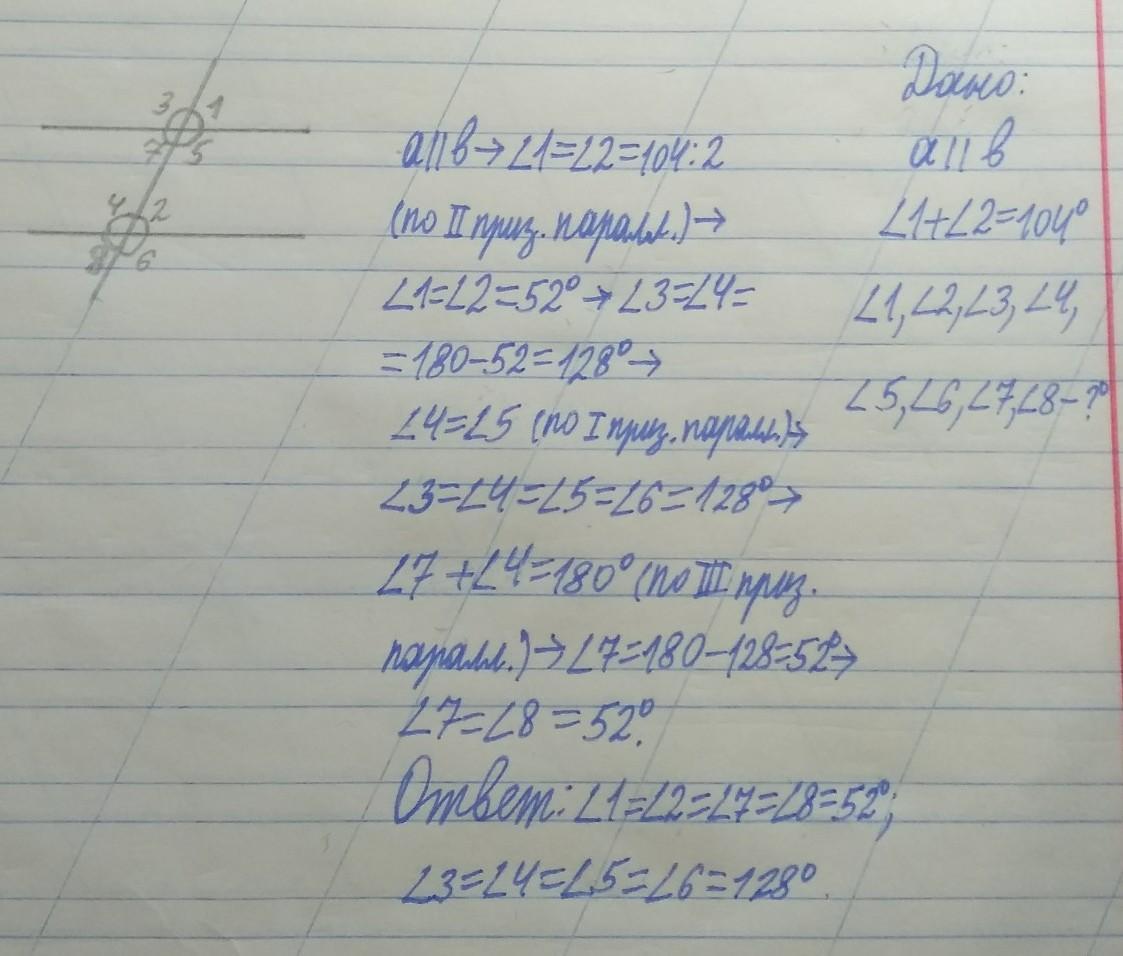При пересечении 2-х параллельных прямых секущей сумма соответственных углов равна 104 градуса. Найти все углы.