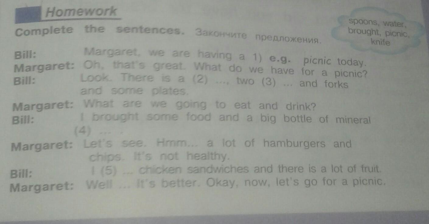 в четвёртом поставила "water"(вода) так как речь идёт о продуктах, также можно догадаться по раньше поставленному слову "mineral", тоесть минеральная. Слово похоже на русское и подходит по логике. Пятое. В пятом требуется глагол. я поставила "brought"(принес) так как в тексте сказано что Билл что то сделал с сендвичами. в ключевых словах в правом верхнем углу нам представлен глагол "brougth"(который собственно и вставила) этот глагол подходит по смыслу.