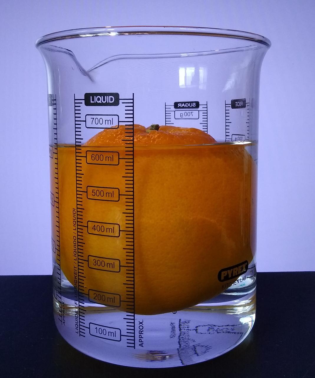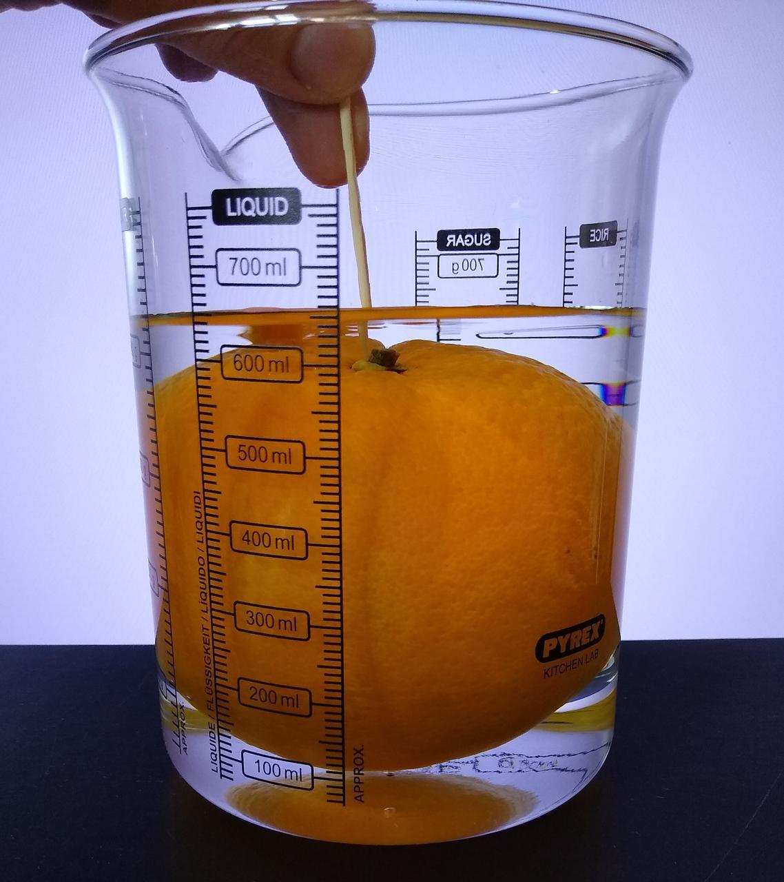В мерный стакан с водой (см. фото ) был помещён апельсин (см. фото ), а затем апельсин с помощью зубочистки «утопили» в воде полностью (см. фото ), причём апельсин не касался дна и стенок. По данным опыта определите плотность апельсина Ответ выразите в кг/м^3