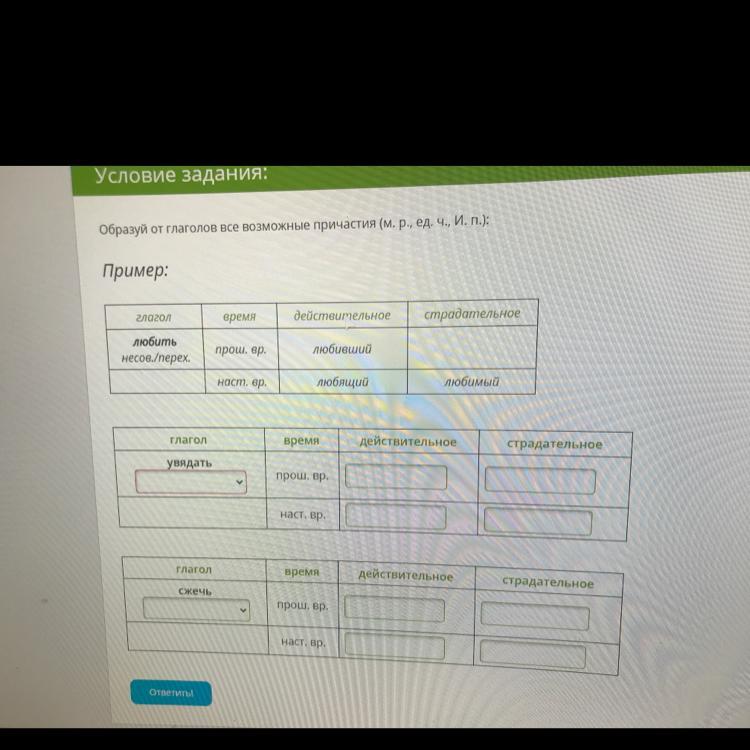 Ответ:1.увядать(наст,любящий,любимый) 2.сжечь(наст,любивший,любимый)