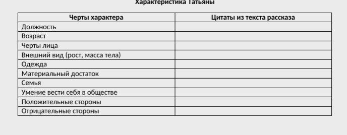 Татьяна является крепостной крестьянкой, прачкой старой барыни. Ей 28 лет. У девушки почти нет родных. По характеру Татьяна является робкой, кроткой, безответной девушкой. Она трудолюбива и молчалива. Татьяна очень боится своей барыни и старается всегда хорошо выполнять свою работу. Трудолюбивая и кроткая Татьяна нравится глухонемому дворнику Герасиму, который надеется жениться на ней. Однако старая барыня в конце концов выдает Татьяну замуж за пьяницу Капитона.