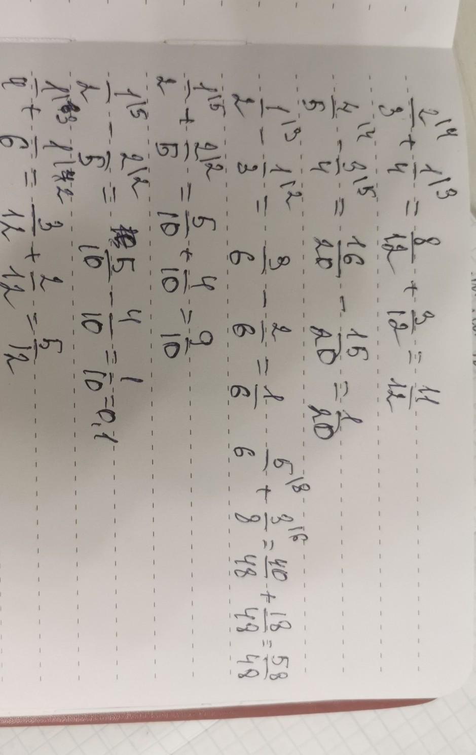 Решение дробей 2/3+1/4, 4/5-3/4, 1/2-1/3, 5/6+3/8, 1/2+2/5, 1/2-2/51/4+1/6, 9/10-5/6, 3/4+2/3, 3/5-1/3, 3/4-2/3, 3/4+3/14, 1/4-1/6, 3/5+1/3, 4/5+3/4, 7/10-1/4 нужно фото решение