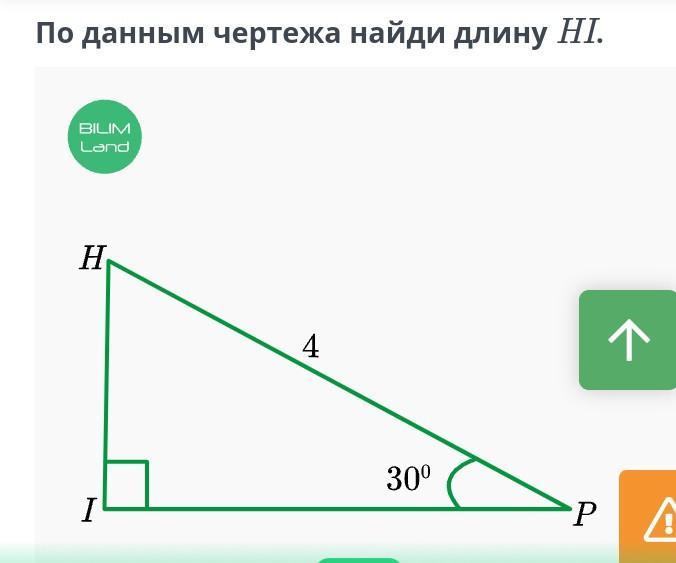 На данном чертеже изображен прямоугольный треугольник. Его гипотенуза HP равна 4, ∠HPI равен 30°.