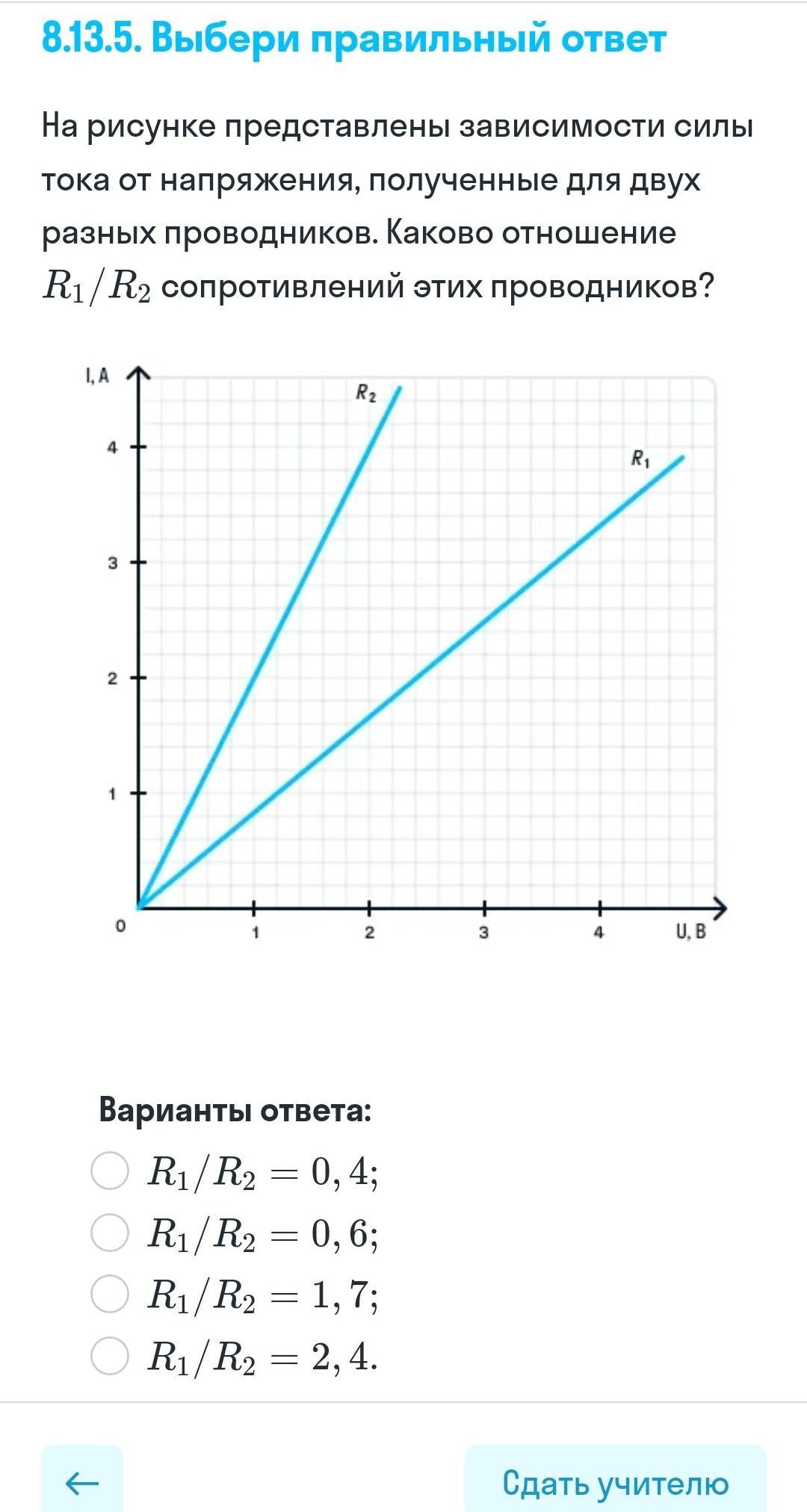 Ha рисунке представлены зависимости силы тока от напряжения, полученные для двух разных проводников. Каково отношение R1/R2 сопротивлений этих проводников?