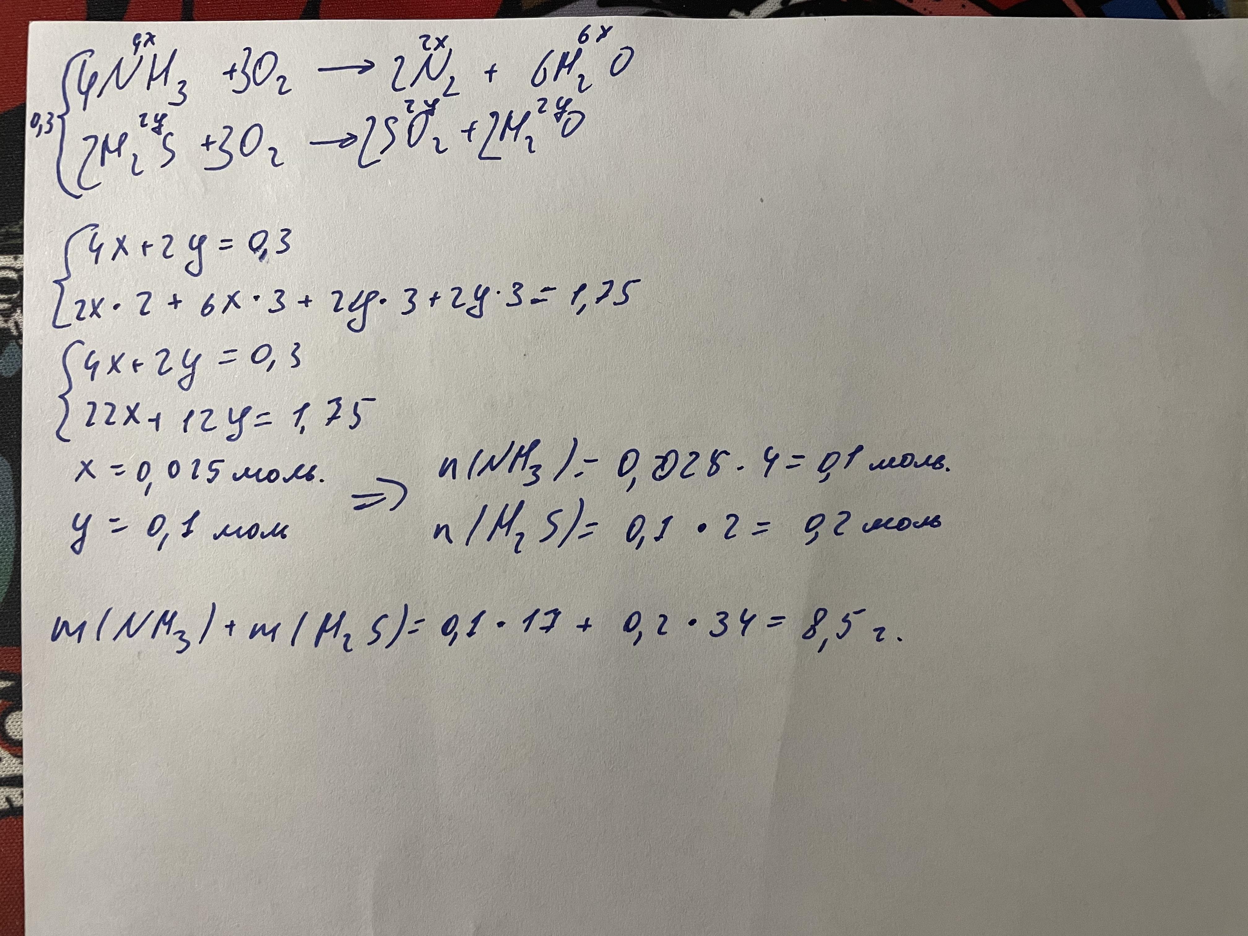 умоляю вас помогите пожалуйста, дам 50 баллов. 0,3 mоl смеси NH3 и H2S сожгли в избытке кислорода. Общее количество атомов в продуктах реакции составило 1,75 mol. Определите массу (g) начальной смеси. А) 6,8 В) 5,95 C) 9,35 D) 8,5
