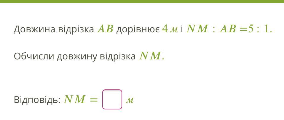 Если длина отрезка NM относится к длине отрезка АВ как 5 : 1, следовательно она (длина отрезка NM) в 5 раз больше длины отрезка АВ.
