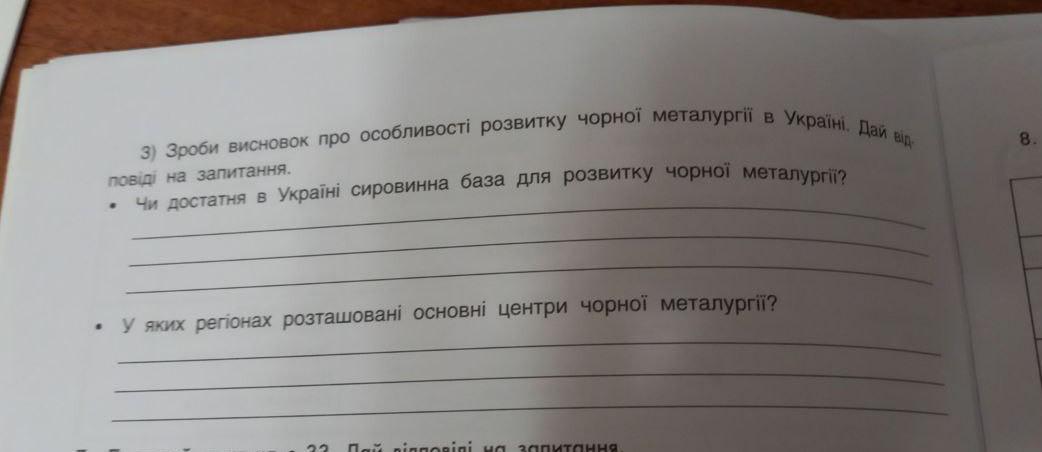 1.Для розвитку чорної металургії в Україні є всі умови: величезна, компактно розміщена сировинна база (залізні, марганцеві руди, вогнетриви, флюсові вапняки тощо); споживач (металоємне машинобудування); густа транспортна мережа; значні паливні (коксівне вугілля) та трудові ресурси