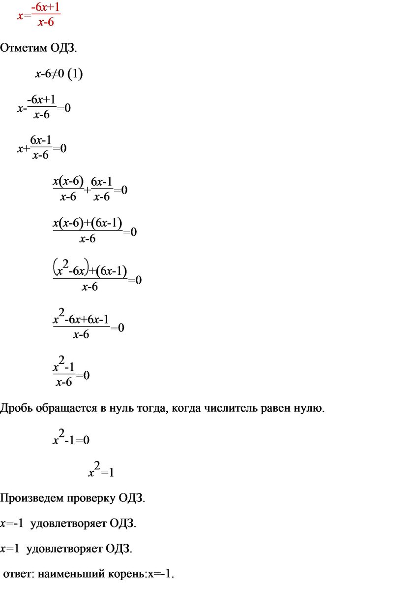 Найдите корень уравнения: x=(-6x+1)/(x-6) . Если уравнение имеет более одного корня, укажите меньший из них