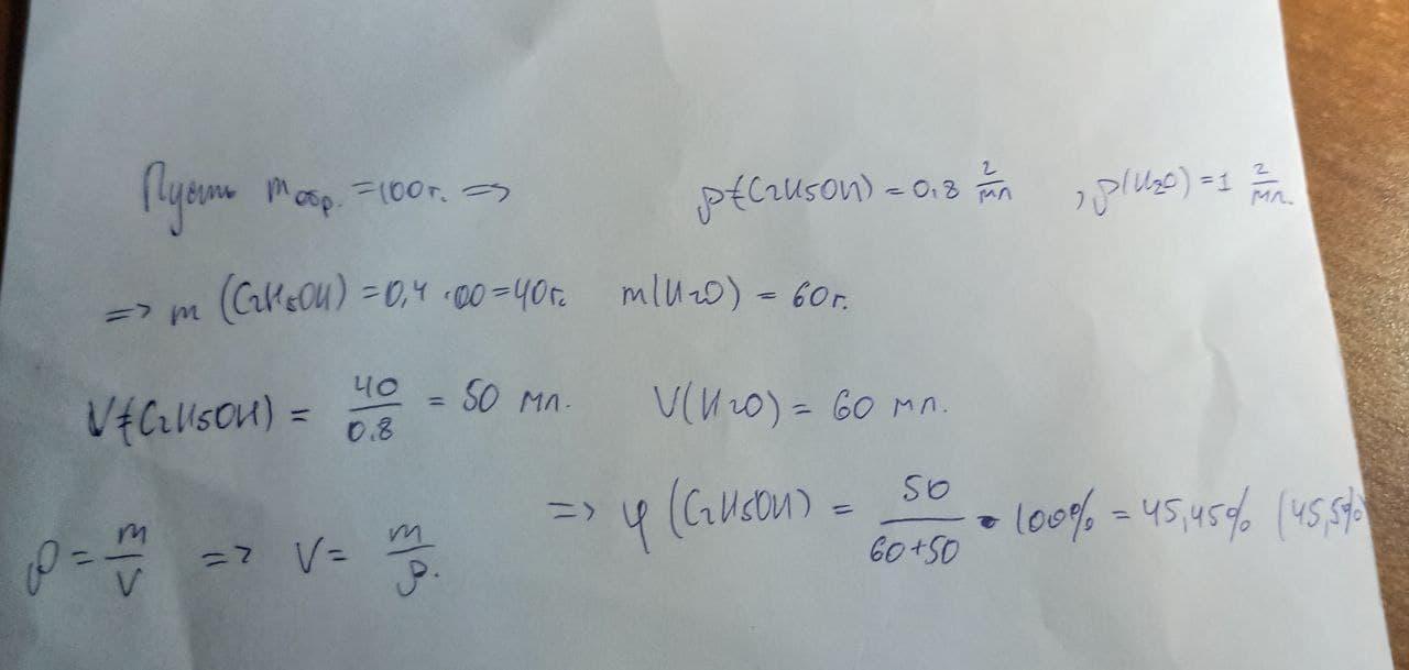 5.27. Массовая доля метанола в водном растворе ранна 40 %. Определите объемную долю (в процентах) метанола. Плотность метанола равна 0,8 г/мл, воды г/мл. Изменением объемов при смешивании пренебречь.