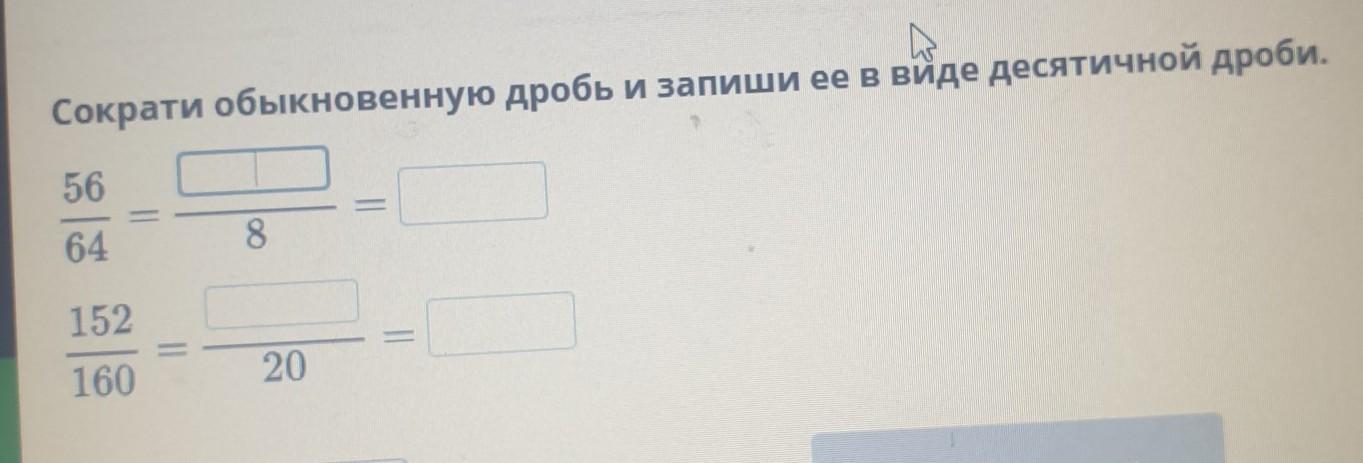 Сократи обыкновенную дробь и запиши ее в виде десятичной дроби. 56 64 8 152 160 20