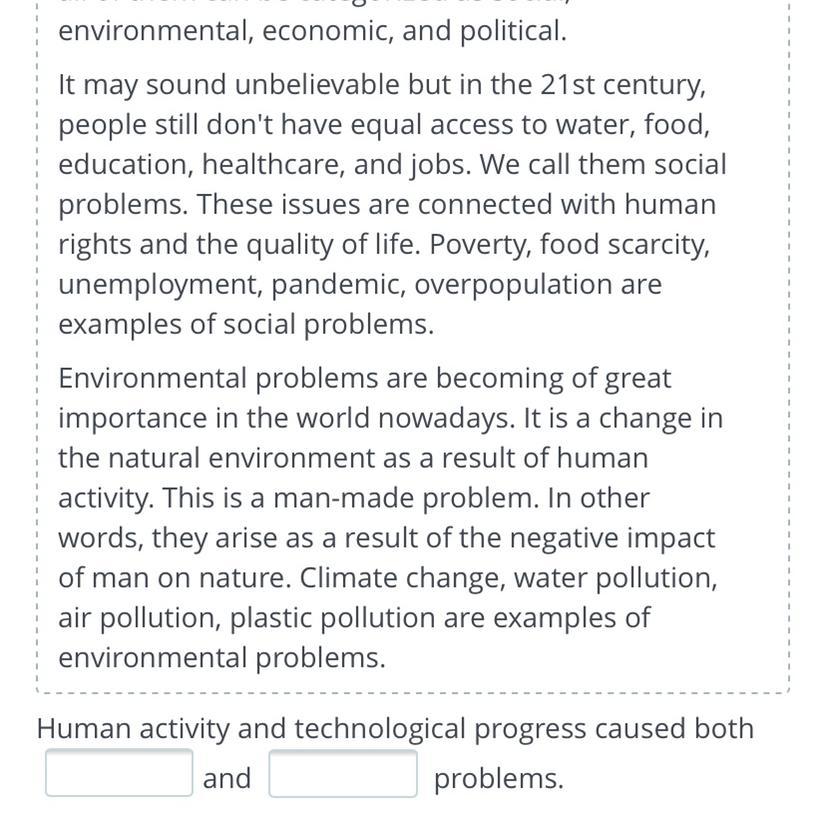 It may sound unbelievable but in the 21st century, people still don't have equal access to water, food, education, healthcare, and jobs. We call them social problems. These issues are connected with human rights and the quality of life. Poverty, food scarcity, unemployment, pandemic, overpopulation are examples of social problems.