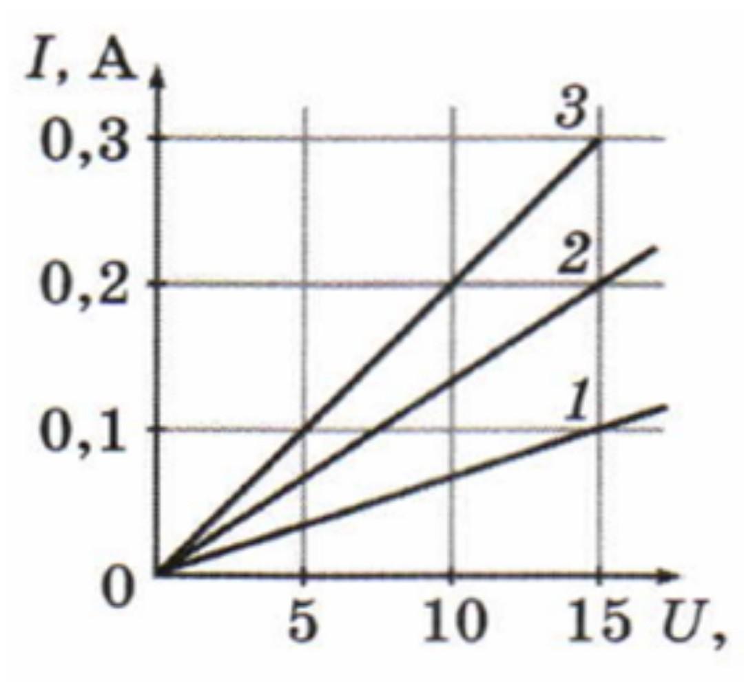 На рисунке показана зависимость тока от напряжения для трех проводников. Определить сопротивление каждого.