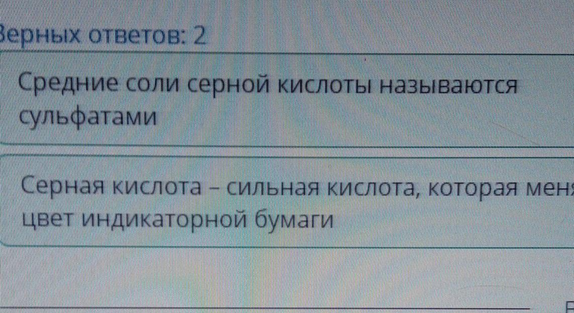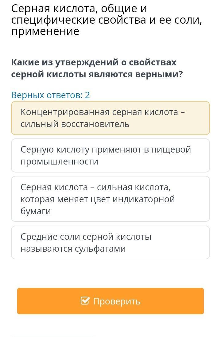 Серная кислота, общие и специфические свойства и ее соли, применение Какие из утверждений о свойствах серной кислоты являются верными? Верных ответов: 2