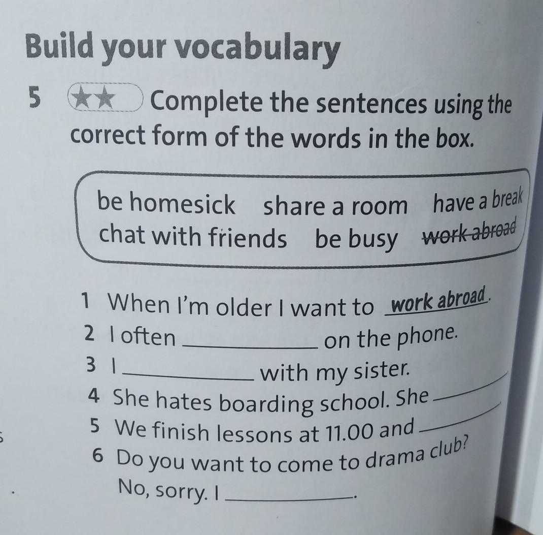 Build your vocabulary 5 ** Complete the sentences using the correct form of the words in the box. be homesick share a room have a break chat with friends be busy work abroad 1 When I'm older I want to work abroad . 2 I often on the phone. 31 with my sister. 4 She hates boarding school. She 5 We finish lessons at 11.00 and 6 Do you want to come to drama club? No, sorry. I