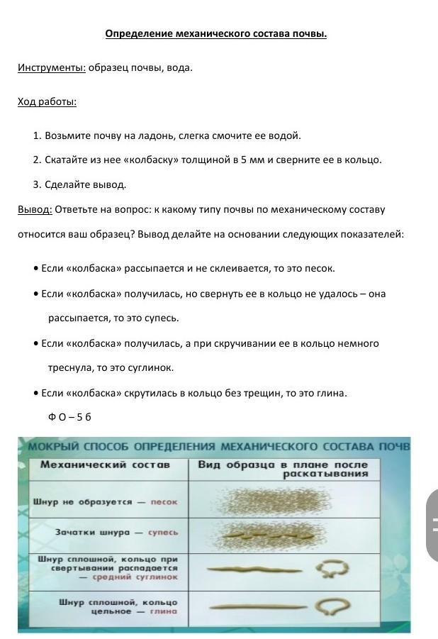 1. Возьмите почву на ладонь, слегка смочите ее водой. 2. Скатайте из нее «колбаску» толщиной в 5 мм и сверните ее в кольцо. 3. Сделайте вывод. Вывод: Ответьте на вопрос: к какому типу почвы по механическому составу относится ваш образец? Вывод делайте на основании следующих показателей: • Если «колбаска» рассыпается и не склеивается, то это песок. • Если «колбаска» получилась, но свернуть ее в кольцо не удалось – она рассыпается, то это супесь. • Если «колбаска» получилась, а при скручивании ее в кольцо немного треснула, то это суглинок. • Если «колбаска» скрутилась в кольцо без трещин, то это глина. плиз помогите пожалуйста
