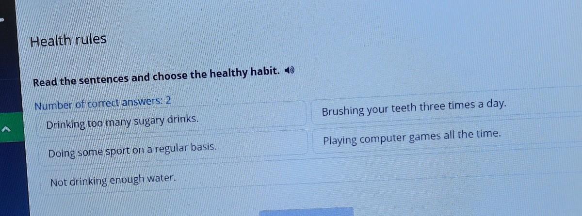 Health rules Read the sentences and choose the healthy habit. ) Number of correct answers: 2 Drinking too many sugary drinks. Brushing your teeth three times a day. Doing some sport on a regular basis. Playing computer games all the time. Not drinking enough water.