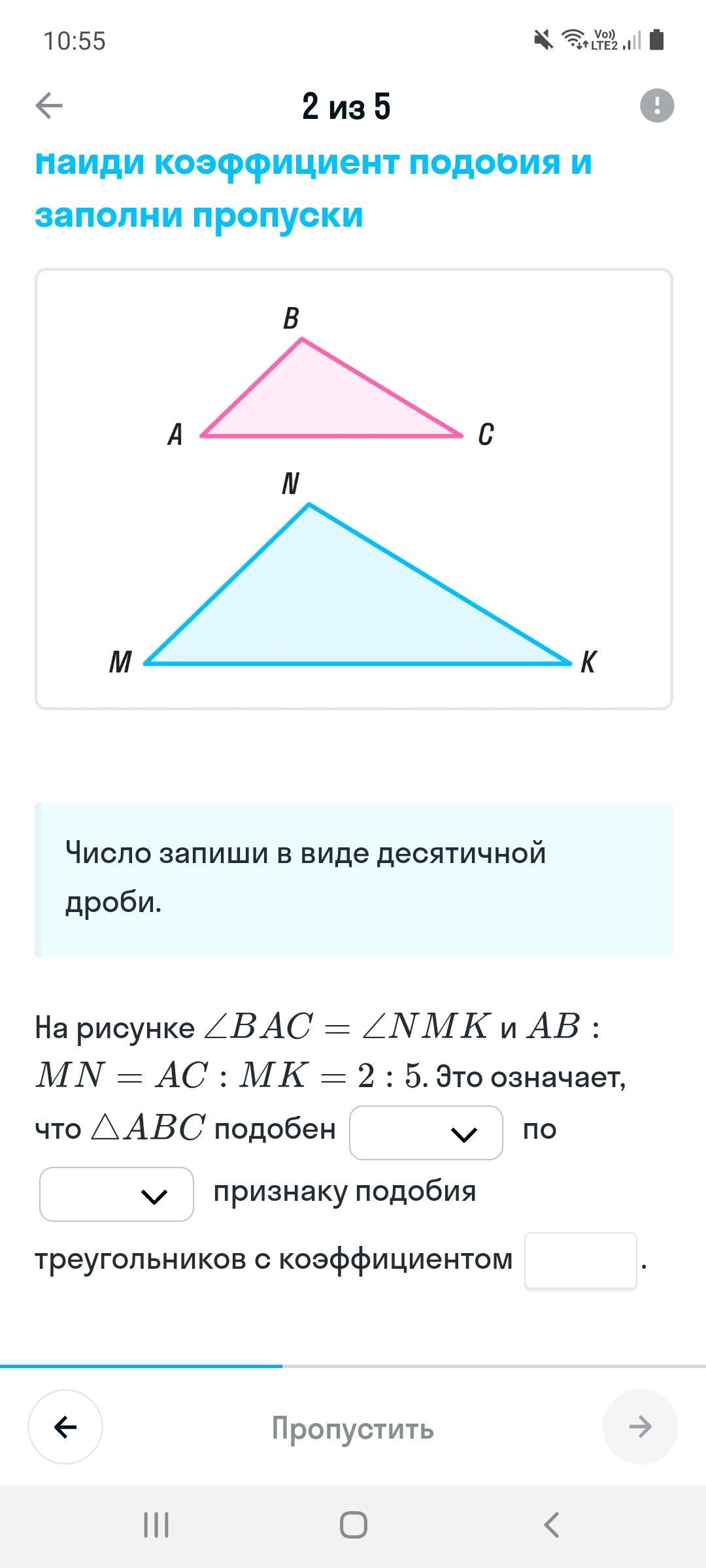 на рисунке угол BAC = углу NMK и AB: MN = AC:MK = 2:5. это означает что треугольник ABC подобен _______ по _______ признаку подобия треугольников с коэффициентом ____.
