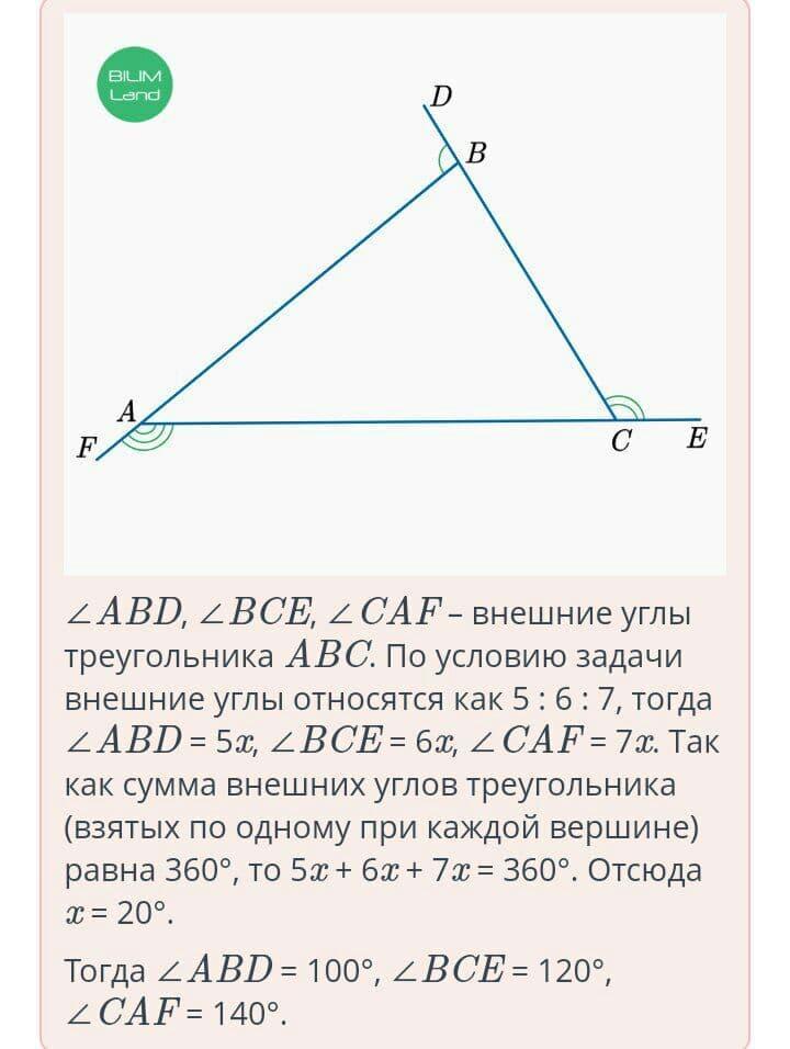 Взятые по одному при каждой вершине треугольника внешние углы относятся как 5 : 6 : 7. Найди наименьший угол из этих внешних углов.