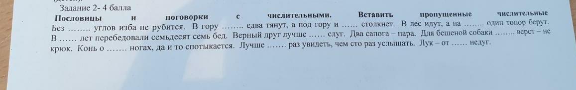 Без четырёх углов изба не рубится. В гору семеро едва тянут, а под гору и один столкнёт. В лес идут, а на троих один топор берут. В семь лет перебедовали семьдесят семь бед. Верный друг лучше сотни слуг. Два сапога- пара. Для бешеной собаки семь верст-не крюк. Конь о четырёх ногах, да и то спотыкается. Лучше один раз увидеть, чем сто раз усышать. Лук- от семи недуг.