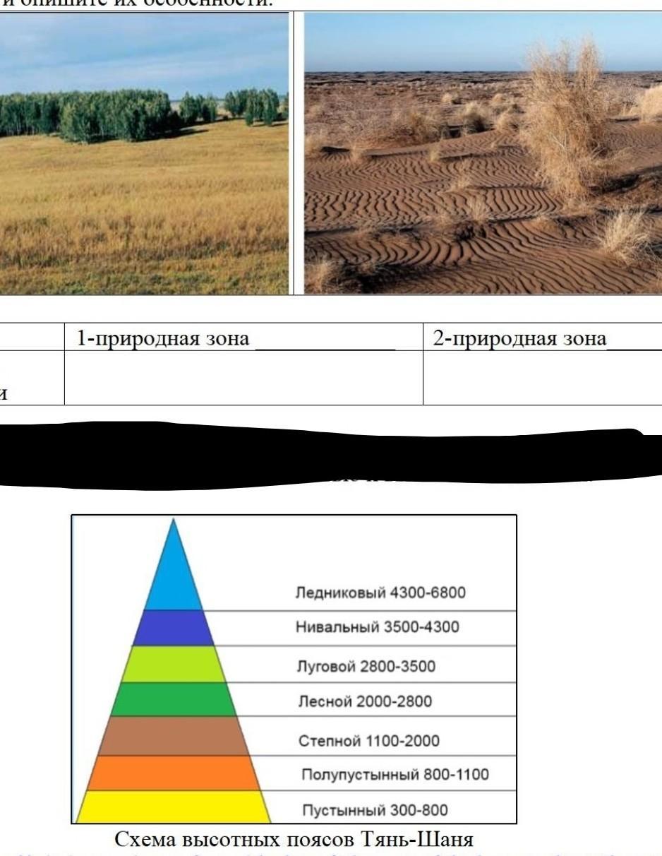 b. При помощи схемы высотных поясов Тянь-Шаня и рисунков 1 и 2-природной зоны, определите различие между широтной зональностью и высотной поясности.