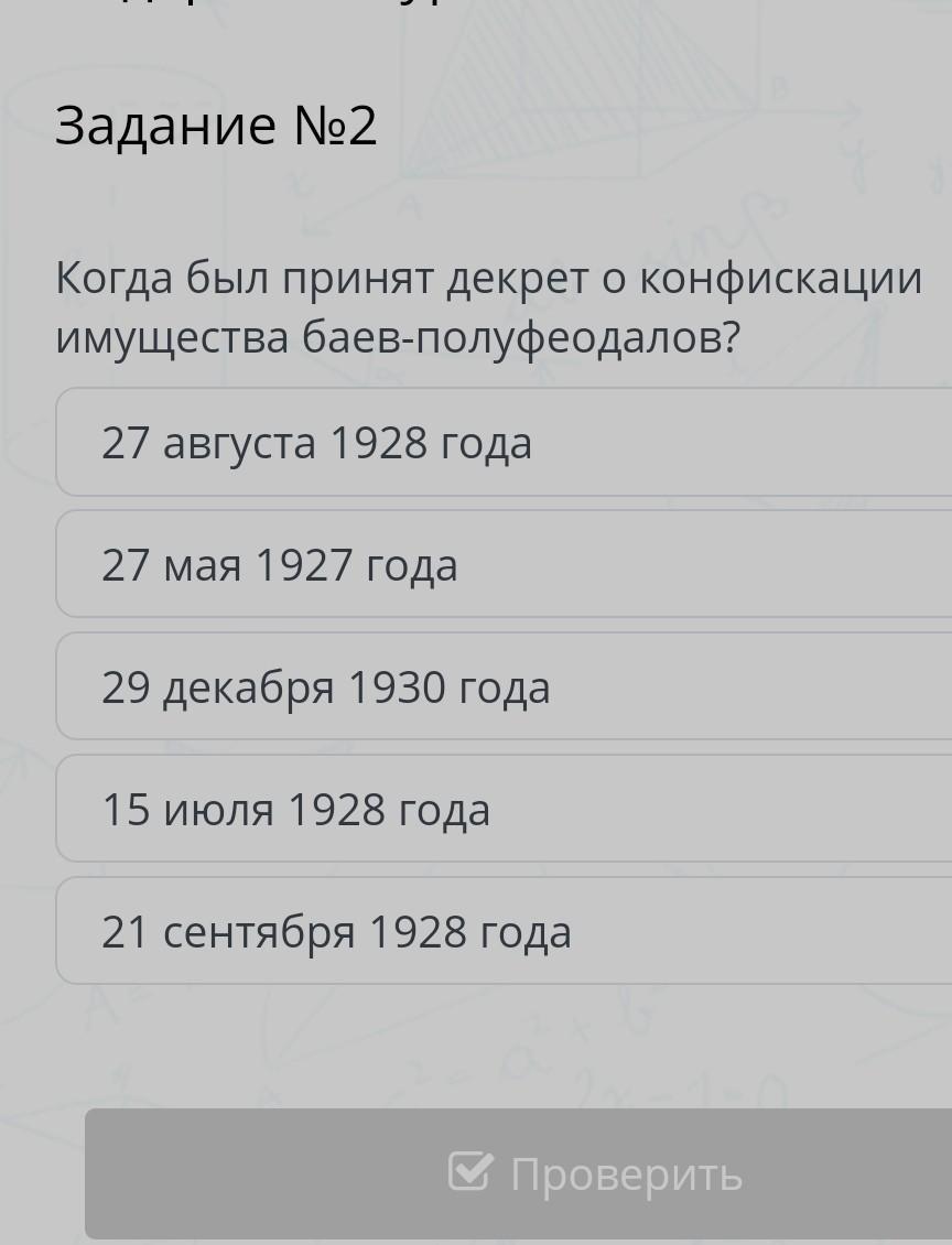 Когда был принят декрет о конфискации имущества баев-полуфеодалов? 27 августа 1928 года 27 МАЯ 1927 года 29 декабря 1930 года 15 ИЮЛЯ 1928 года 21 сентября 1928 года