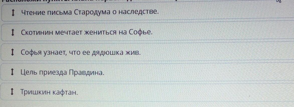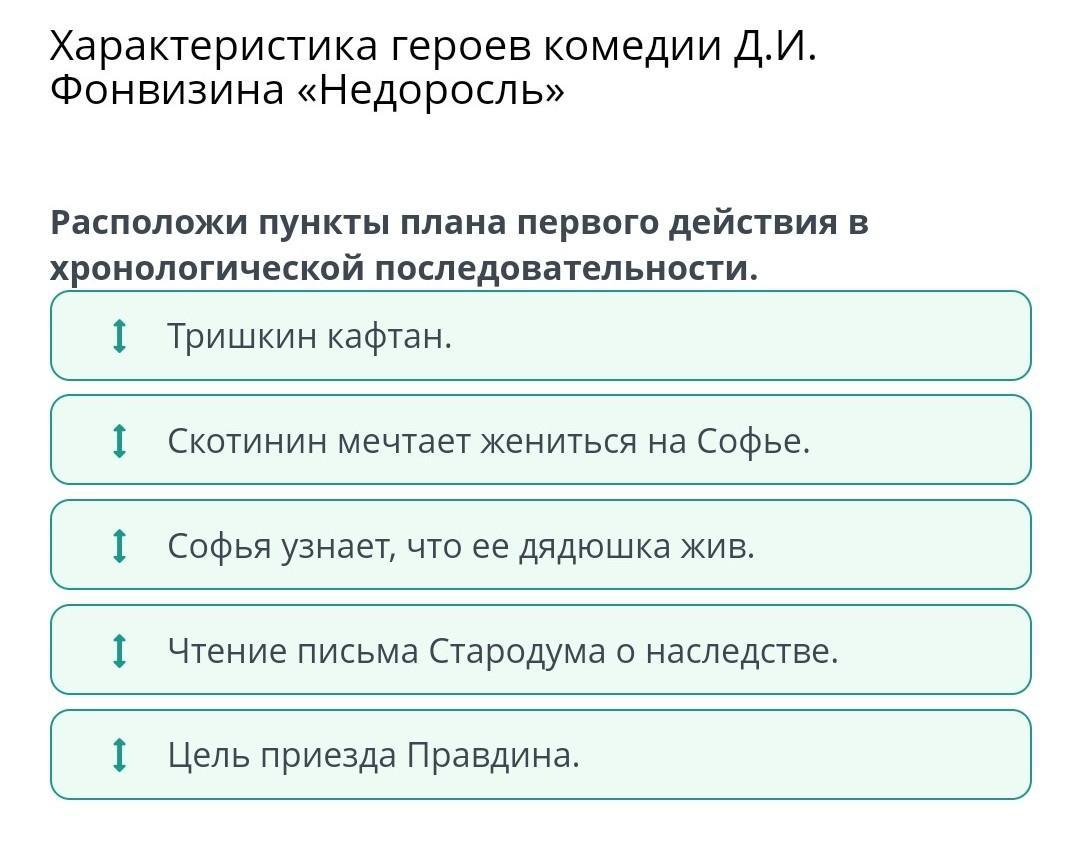 характеристики героев комедии Фонвизина Недоросль. Расположите пункты плана действий в хронологической последовательности