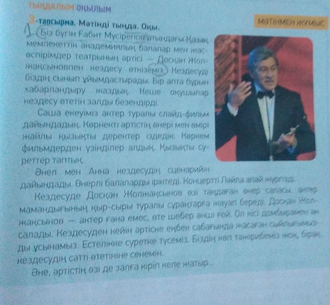 1.Біз бүгін Ғабит Мүсірепов атындағы Қазақ мемлекеттік академиялық балалар мен жасөспірімдер театрының әртісі - Досқан Жолжақсыновпен кездесу өткіземіз.